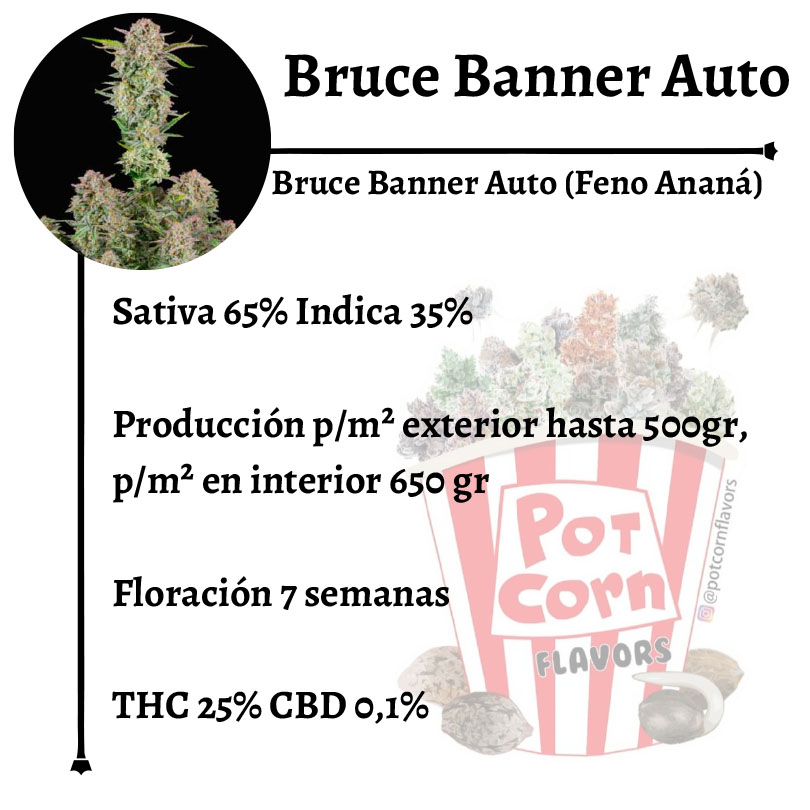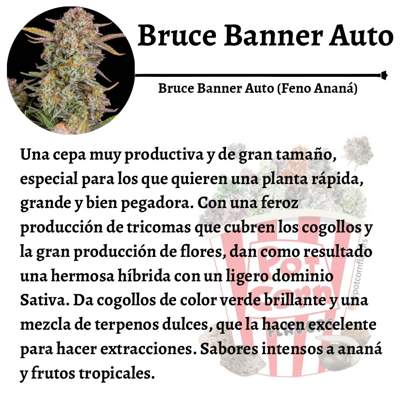 Esta versión automática de Bruce Banner es una gigante rendidora con alma tropical. Ideal para quienes buscan una planta rápida, grande y con alto poder de pegada. En tan solo 7 semanas desarrolla cogollos enormes, cargados de tricomitas brillantes, con un aroma que ya avisa lo que se viene: frutas tropicales y ananá.